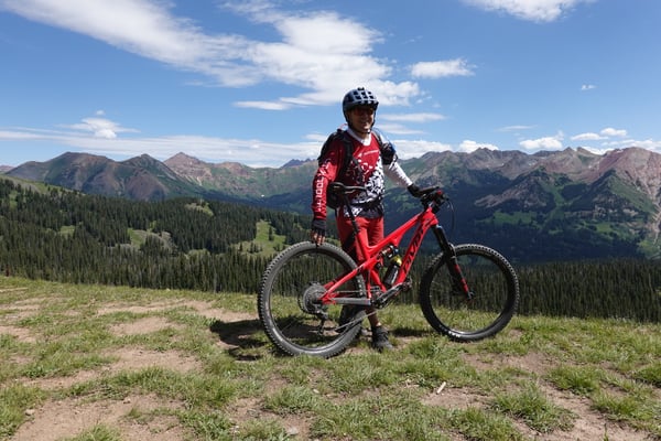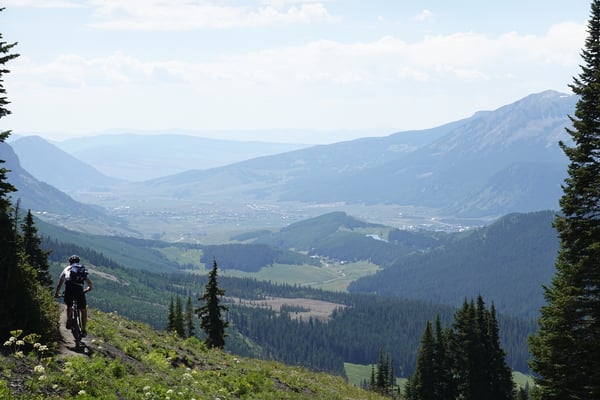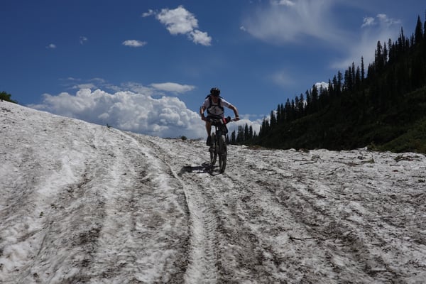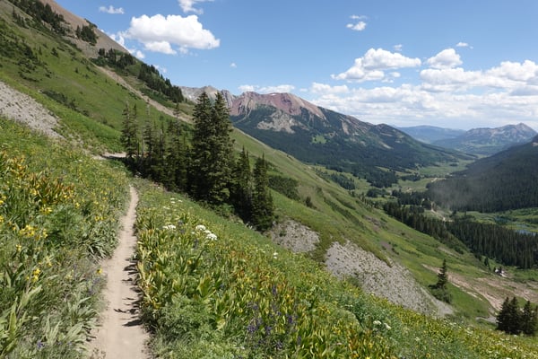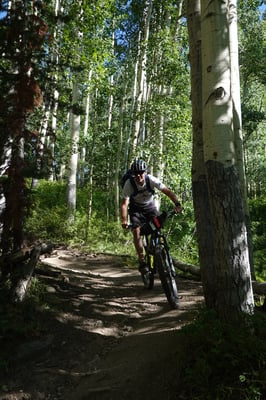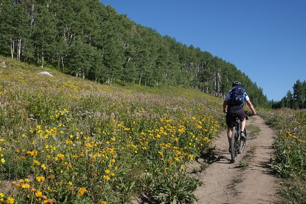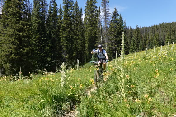 Nach dem Morgenessen im Old Town Inn fahren wir zum Trailhead des Snodgrasstrail an der Gotic Road. Wieder scheint die Sonne von einem wolkenlosen Himmel. Nach einem kurzen knackigen Aufstieg durch Blumenwiesen erreichen wir einen Birkenwald. Ein flüssig zu fahrender Singletrail zieht ins Washington Gulch Valley rein. Zuerst moderat aber gegen Schluss enorm steil bringt uns die breite Dirtroad zum Trailhead des 403 Trails hoch. In den steilen Passagen ist Schieben angesagt. Die Höhenlage von über 3300 m über Meer macht sich wieder deutlich bemerkbar.
