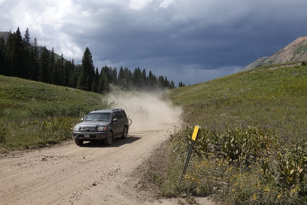 Der erneute Aufstieg zum Schoffieldpass auf der Gothic Road ist etwas weniger steil als auf der Washington Road. Dafür "fressen" wir ausgiebig Staub. Jedes Fahrzeug das vorbeifährt wirbelt gefühlt Tonnen von Staub auf, der endlos in der Luft hängt.