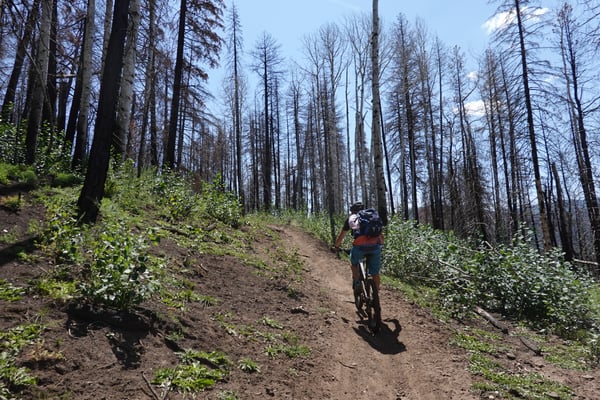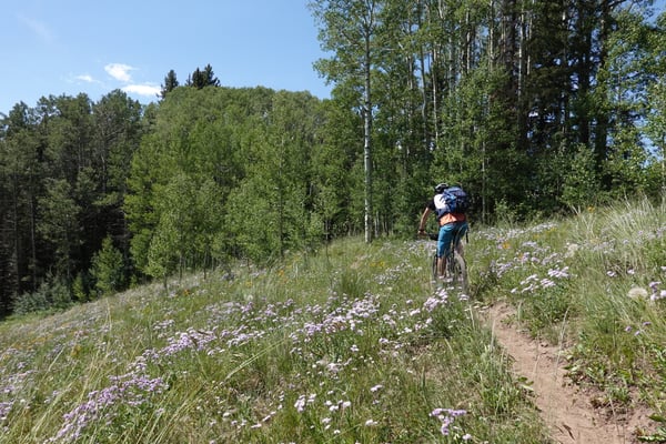 Das letzte Mal sind wir die "Originalroute" durch den Talgrund gefahren. Diesmal testen wir den Rücken wischen Hermosa Creek und Animas Valley aus. Der Nadel- und Birkenwald zwischen den beiden Tälern ist immer wieder von offenen Weideflächen unterbrochen. Entsprechend gut ist die Aussicht auf die umliegenden Bergkämme. Nach einer kurzen Strecke auf einer breiten Forststrasse biegen wir auf den Elkcreek Trail ein. Dem Beginn eines Singletrailvergnüngens sondergleichen.