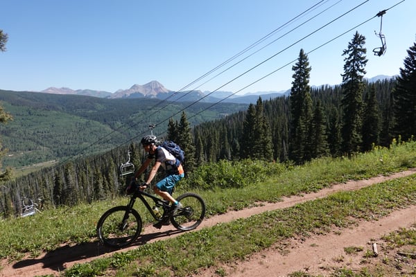 Auf der breiten Hermosacreek Road gewinnen wir rasch an Höhe und biegen auf der Passhöhe ins Skigebiet ein. Man wähnt sich fast ein bisschen in den Alpen. Fahrspuren zum Versorgen der Sesselliftanlagen führen über die Hänge und dienen uns als Trail.